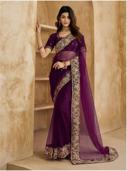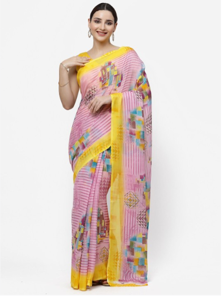 Peach-Coloured & Gold-Toned Embellished Sequinned Pure Georgette Saree