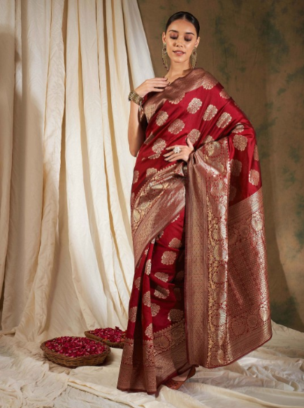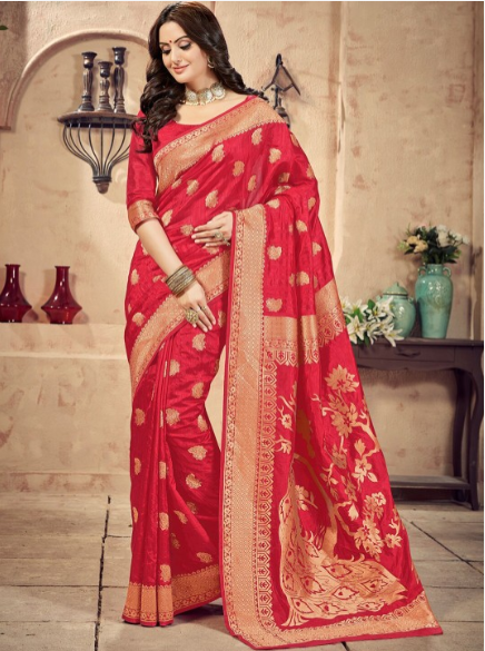 Red & Gold-Toned Floral Woven Design Zari Banarasi Saree