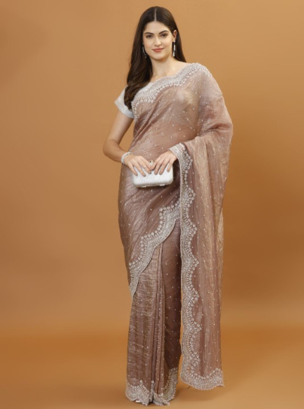 Peach-Coloured & Gold-Toned Embellished Sequinned Pure Georgette Saree