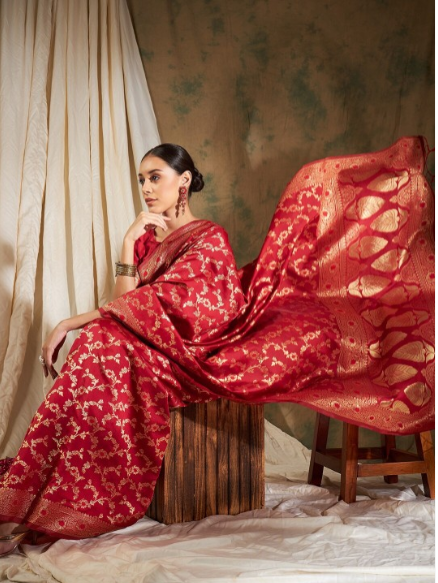 Red & Gold-Toned Floral Woven Design Zari Banarasi Saree